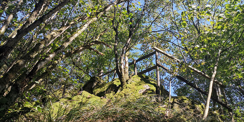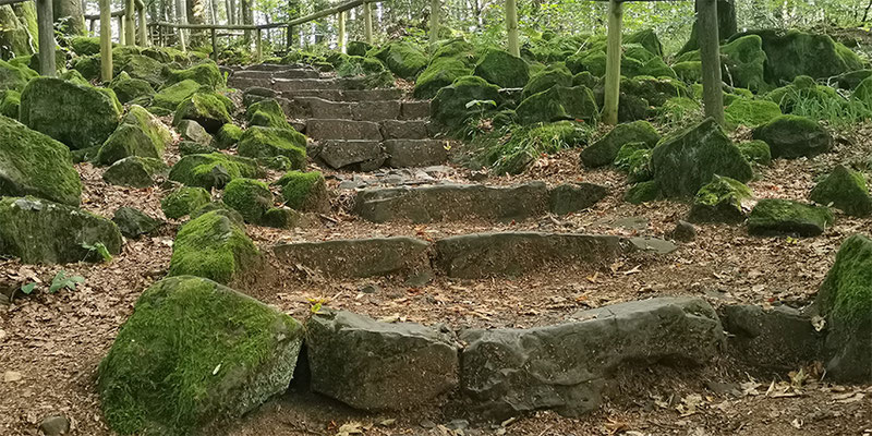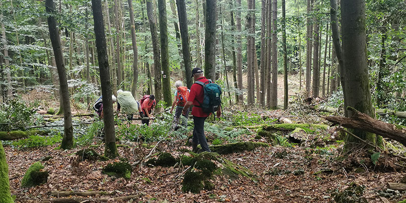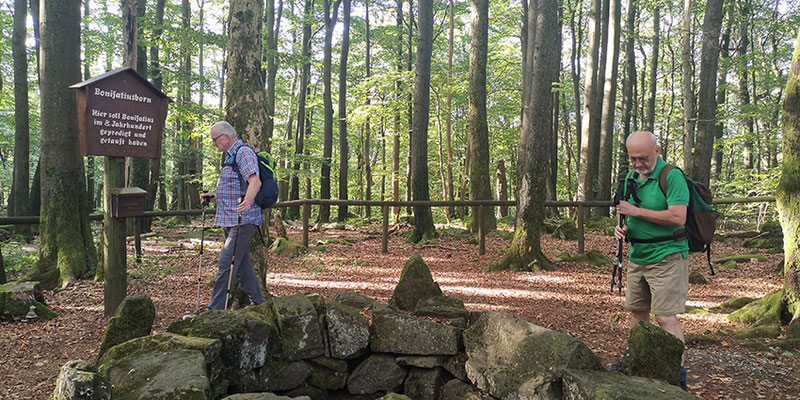 Kaum hatten wir den Parkplatz erreicht, wanderten wir auf schmalen wurzeligen Pfaden. Unser erstes Zwischenziel war der Granitfels Teufelstein. Eine schöne breite Stufentreppe aus Granit brachte uns auf den Fels mit dem Bismarckturm und dem Bonifatiusborn. Hier oben soll Bonifatius gewesen sein. Zurück zum Weg und weiter zum Geiselstein. Dort hinauf war es etwas eng und Gegenverkehr kaum möglich. Ein großes Lob an alle Wanderer. Auch die ältesten unter uns sind hinauf gekraxelt.