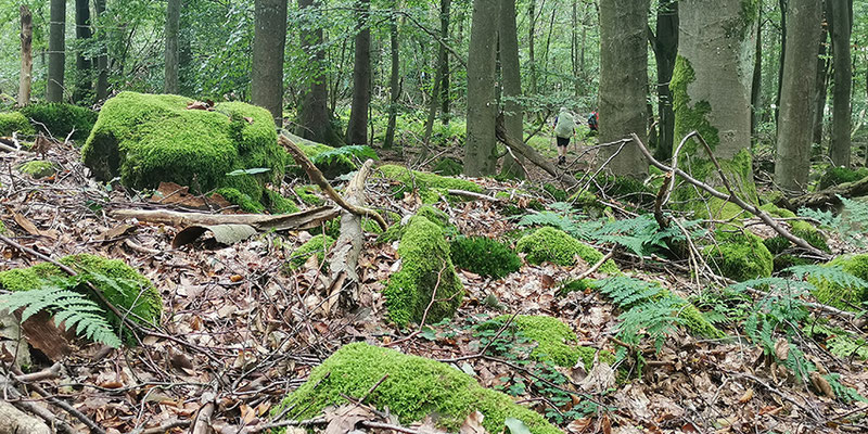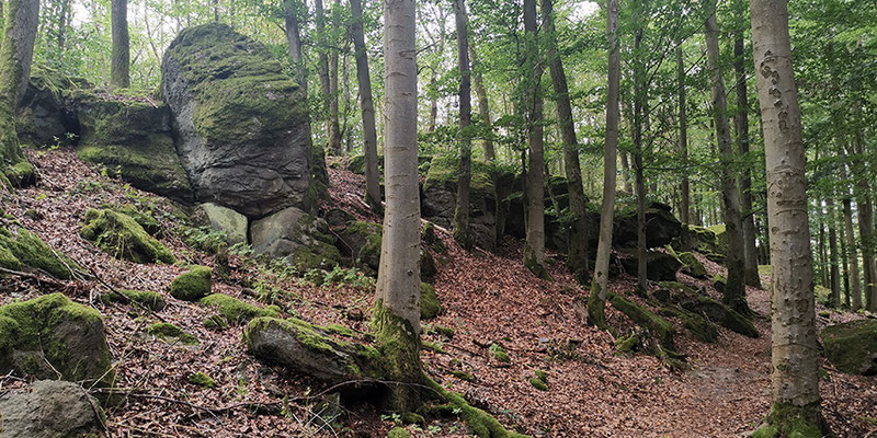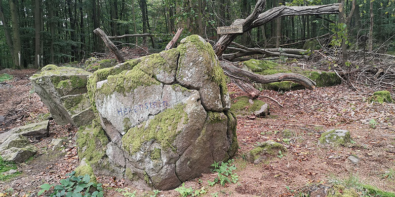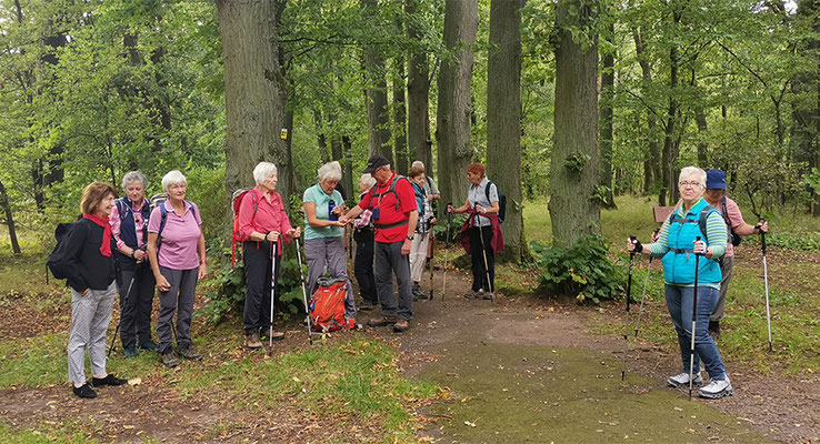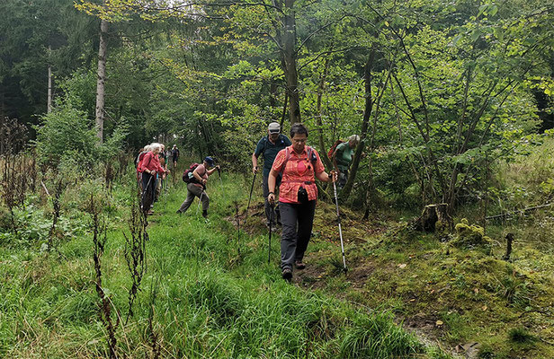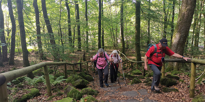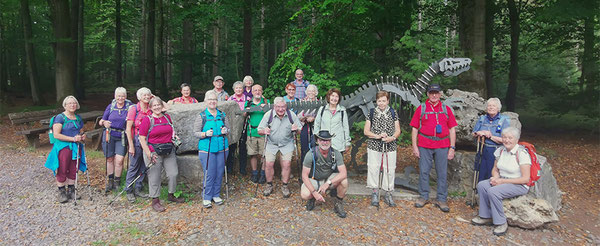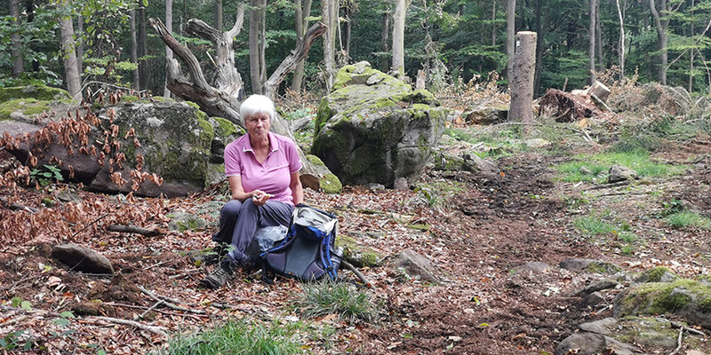Nach knapp acht km verließ die Kurzwandergruppe die Langstreckenwanderer und machte sich auf den Rückweg. Zunächst in den Ort Herbstein und dann zurück zu den Autos. Die Langstreckler hatten noch acht km vor sich. Auf dem Weg lag noch der Hexenstein, an dem das mitgebrachte Picknick vernichtet wurde. Zurück ging es dann am Weißentornteich vorbei und anschließend durch eine alte, traumhafte Allee. Ein Aufstieg musste es noch sein. Ohne diesen hätten wir die Felsenruhe verpasst – ein Felsenhang, durch den unser Pfad sich windete. Walter hatte zum Glück im Café vom Thermalbad gewartet. Die Rückfahrt nach Schotten war gesichert.