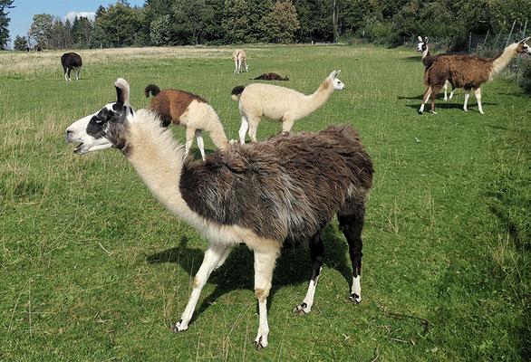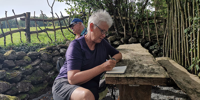 Für uns war es noch zu früh für einen längeren Aufenthalt. Es dauerte nicht lange und die zweite Überraschung auf unserem Weg veranlasste uns nun doch dazu eine Pause einzulegen. Hier hatte jemand einen wunderbaren Pausenplatz eingerichtet. Besonders ein sonderbarer Heuballen (siehe Foto) hatte die Lacher auf seiner Seite. Auch hier gab es wieder Getränkekisten und sogar ein „Gipfelbuch“, in das uns Gabi eingetragen hat.