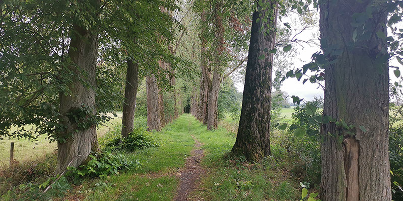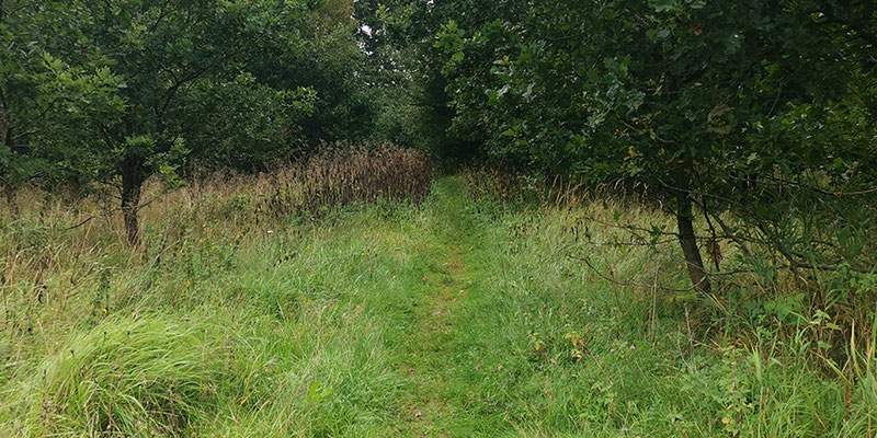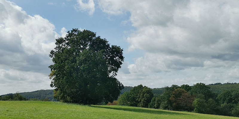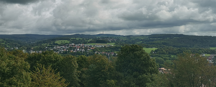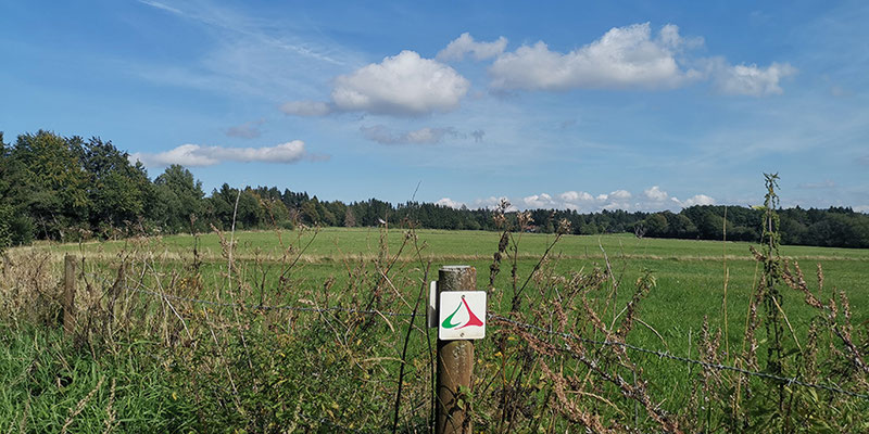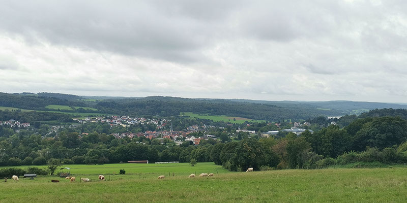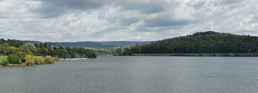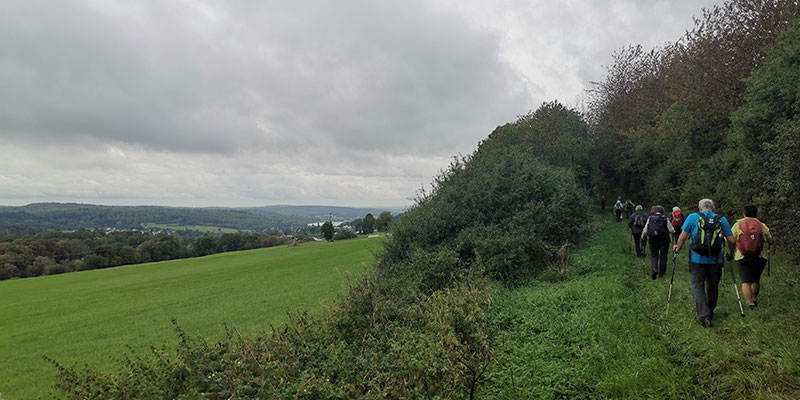 Heute hatten wir es gut – keine Busanreise, keine Autofahrt > einfach loslaufen vom Hotel. Es ging sozusagen nach hinten heraus. Ein Bogen zeichnete unseren Weg, so dass wir über Wiesen und Ackerwegen zunächst oberhalb vom Hotel waren und von dort über Schotten hinweg bis zur Niddatalsperre – unserem Zwischenziel – sehen konnten.