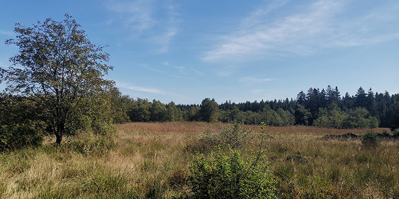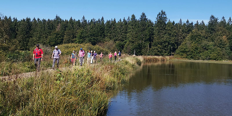 An dieser Stelle trennte sich die Wandergruppe. Die kürzere Wanderung verlief über Forstwege bis zur Niddaquelle. Die längere Strecke ging auf sehr kleinen Pfaden immer um ein kleines Naturschutzgebiet herum. Bei den Forellenteichen trennten sich erneut die Wege. Die Kurzwandergruppe kürzte ab und wanderte direkt zurück zum Hoherodskopf, um sich dort umzuschauen und den Wandertag mit einer Einkehr ausklingen zu lassen.