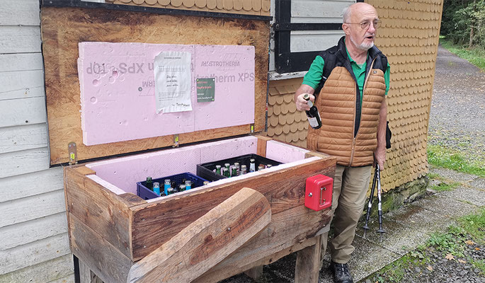 Nach Herbstein benötigten wir eine knappe halbe Stunde mit den PKW’s. Beim Thermalbad war unser Startpunkt. Erster Fotostop bereits nach 500 m. Eine alte Kreuzkapelle mit schönem Holzvorbau bewegt uns alle die Kameras (Smartphone) zu zücken. Durch Naturschutzgebiet Talauen Wanderten wir auf kleinen Pfaden und Wiesenweg an zwei Seen vorbei. Bei einem Parkplatz wurden wir freudig überrascht. Hatten doch freundliche Menschen eine Truhe mit Getränken gefüllt. Genau das Richtige für Wanderer, die sich mit einem Drink erfrischen möchten.